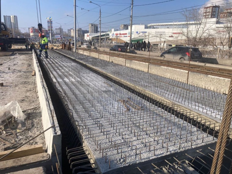 Их монтаж стал возможен благодаря укладке в центральной части сооружения балок под трамвайную часть, с устройством монолитной плиты. Сейчас на этом участке размещается строительная техника, задействованная на укладке балок.